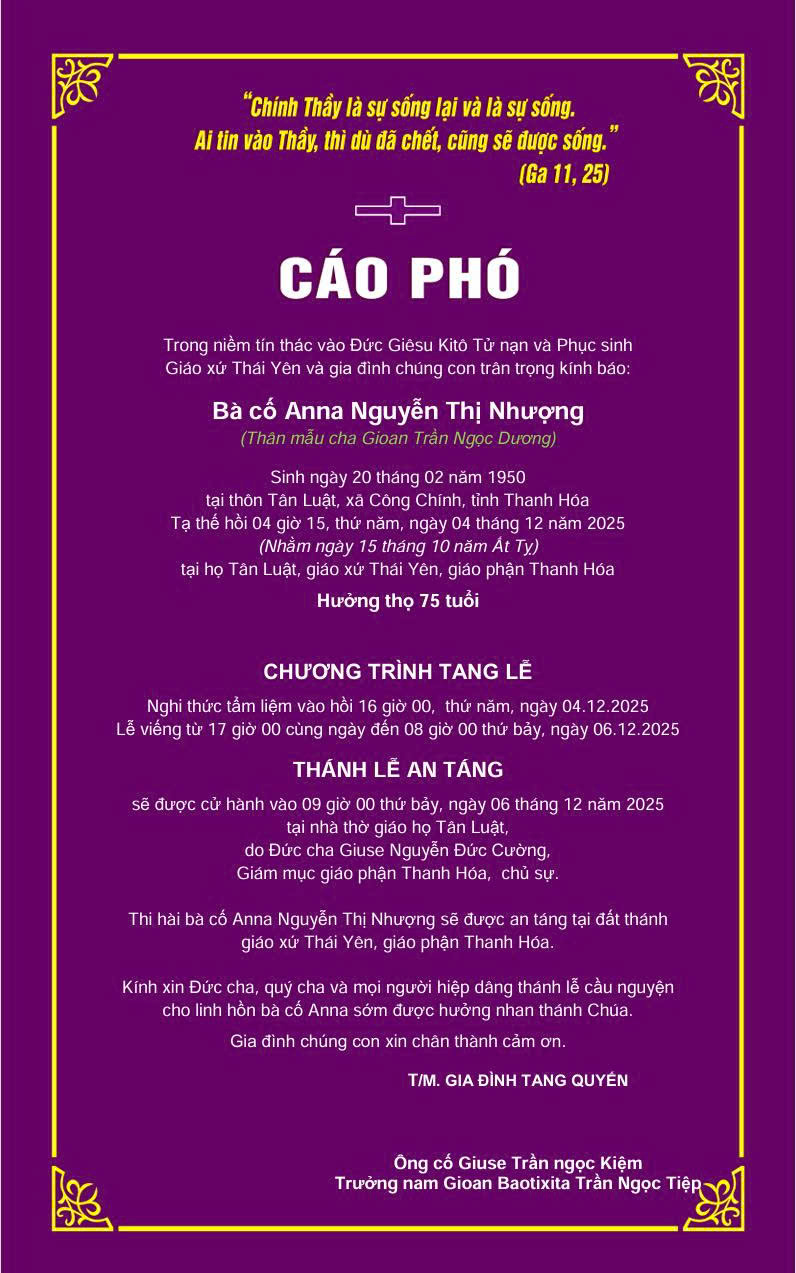 Cáo phó: Bà cố Anna Nguyễn Thị Nhượng, thân mẫu cha Gioan Trần Ngọc Dương, đã an nghỉ trong Chúa vào ngày 04/12/2025
