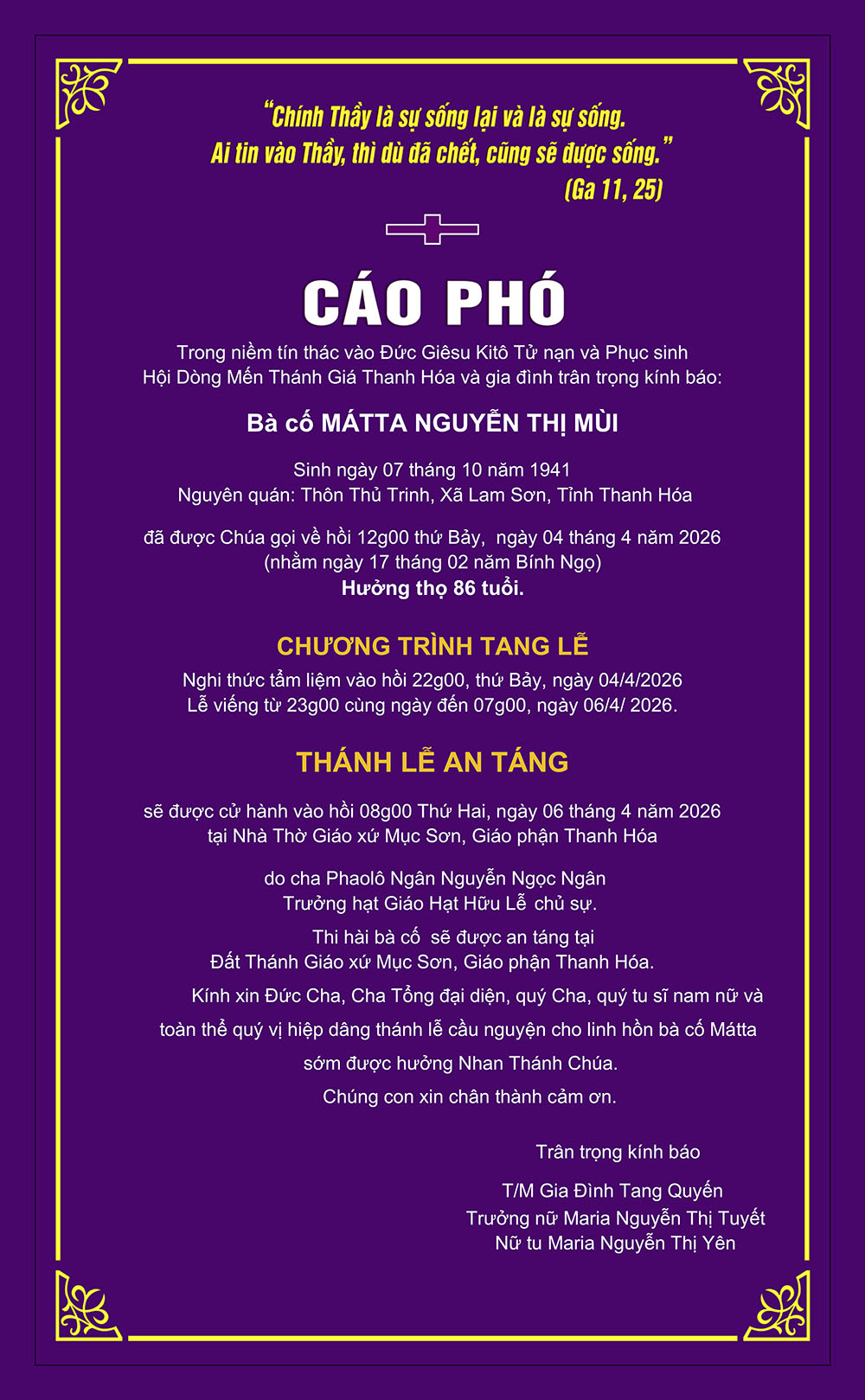 Cáo phó: Bà cố Mátta Nguyễn Thị Mùi, thân mẫu nữ tu Maria Nguyễn Thị Yên đã an nghỉ trong Chúa, ngày 04/04/2026