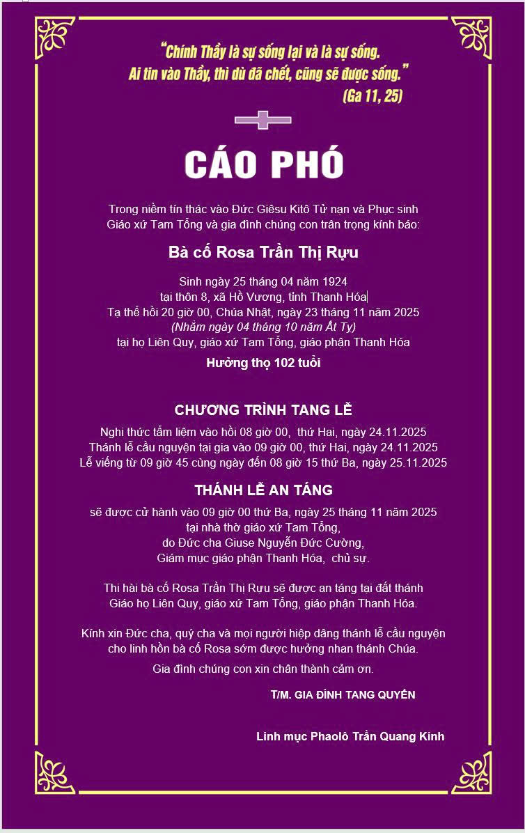 Cáo phó: Bà cố Rosa Trần Thị Rựu, thân mẫu linh mục Phaolô Trần Quang Kính đã an nghỉ trong Chúa, ngày 23/11/2025