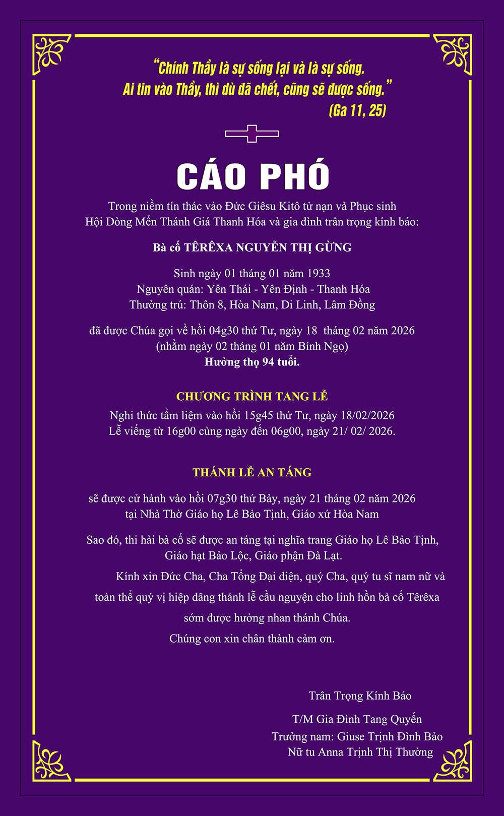 Cáo phó: Bà cố Têrêxa Nguyễn Thị Gừng, thân mẫu Nữ tu Anna Trịnh Thị Thường, Dòng mến thánh giá Thanh Hoá đã an nghỉ trong Chúa, ngày 18/02/2026