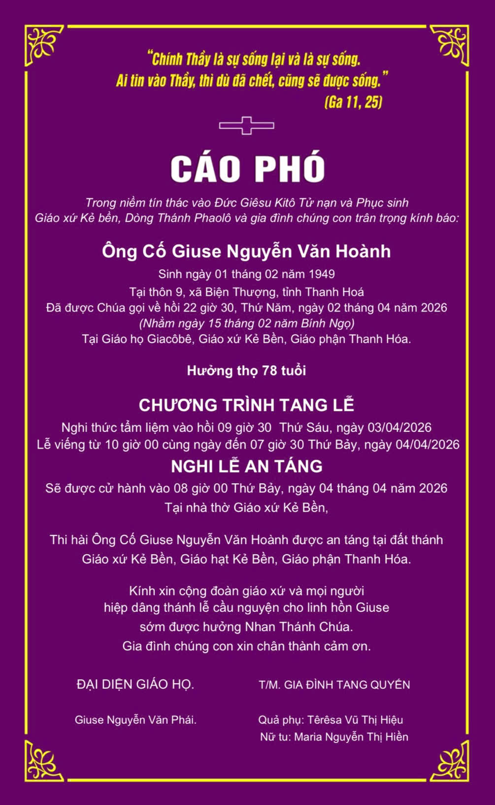 Cáo phó: Ông cố Giuse Nguyễn Văn Hoành, thân phụ nữ tu Maria Nguyễn Thị Hiền Dòng Thánh Phaolô, đã an nghỉ trong Chúa, ngày 02/04/2026