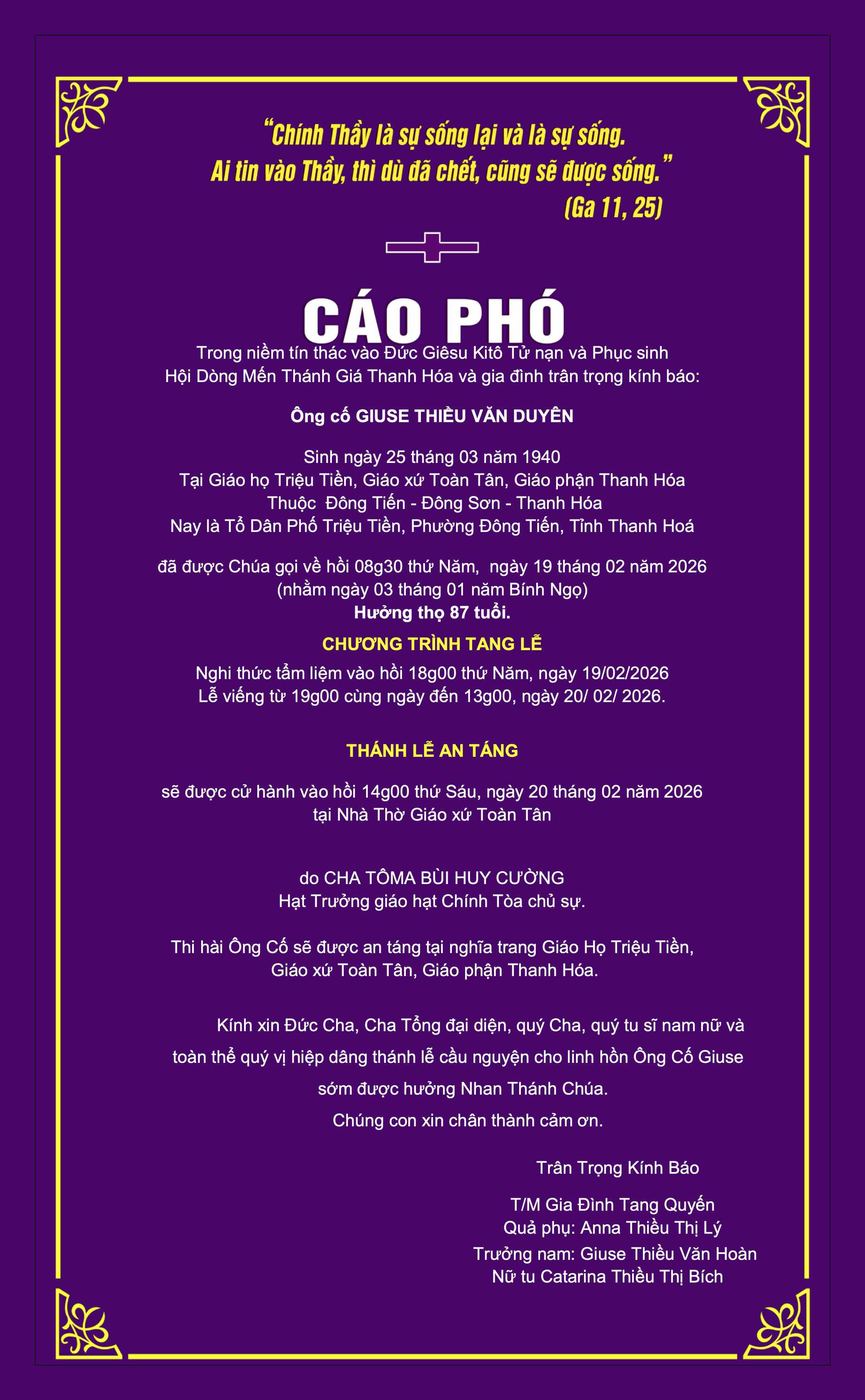 Cáo phó: ông cố Giuse Thiều Văn Duyên, thân phụ nữ tu Catarina Thiều Thị Bích đã an nghỉ trong Chúa, ngày 19/02/2026