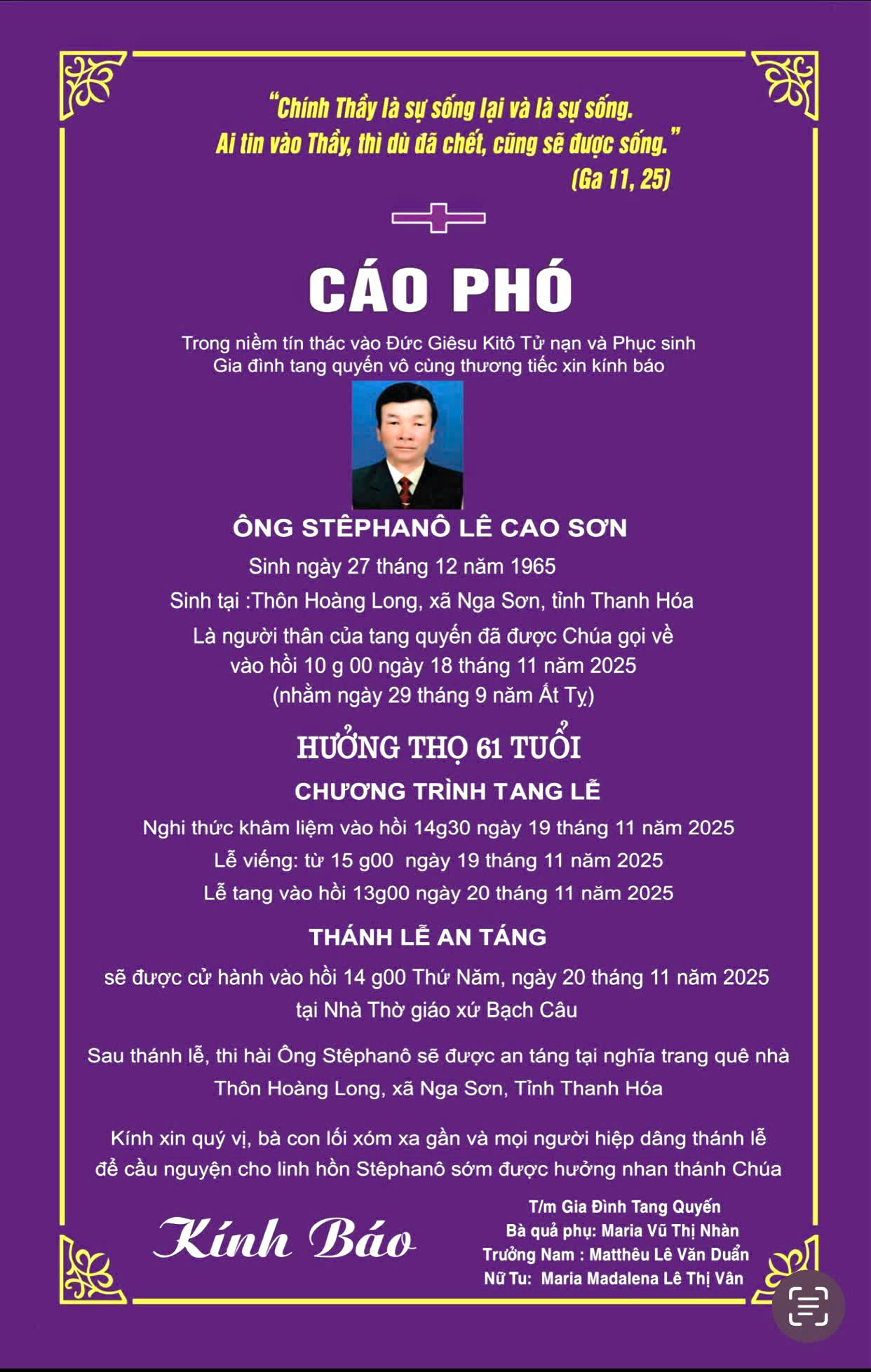 Cáo phó: Ông cố Stêphanô Lê Cao Sơn, thân phụ nữ tu Maria Mađalêna Lê Thị Vân đã an nghỉ trong Chúa | Ngày 18/11/2025