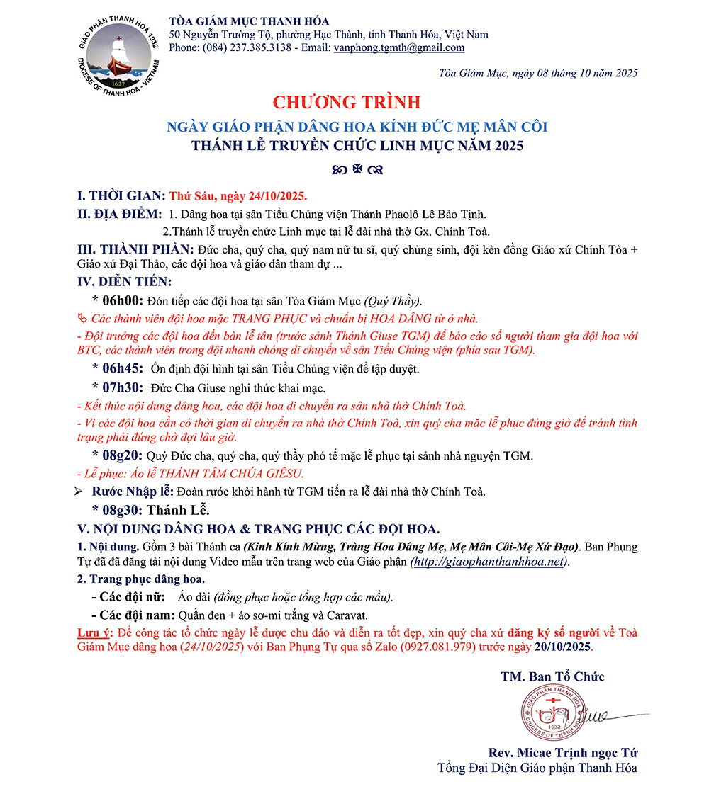 Thông báo: Chương trình ngày giáo phận dâng hoa kính Đức Mẹ Mân Côi và Thánh lễ truyền chức linh mục năm 2025