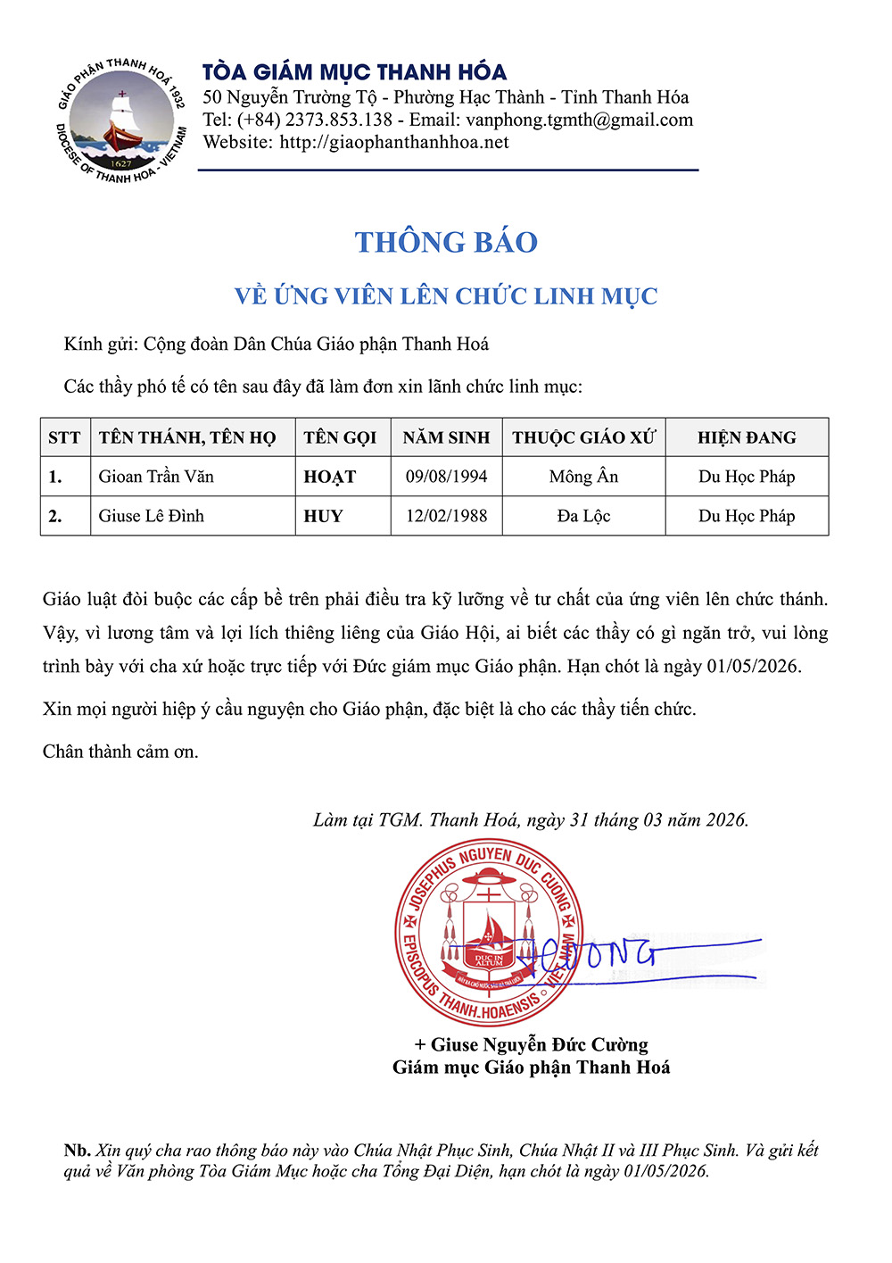 Thông báo: Ứng viên lên chức Linh mục năm 2026