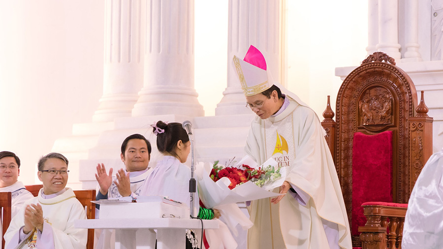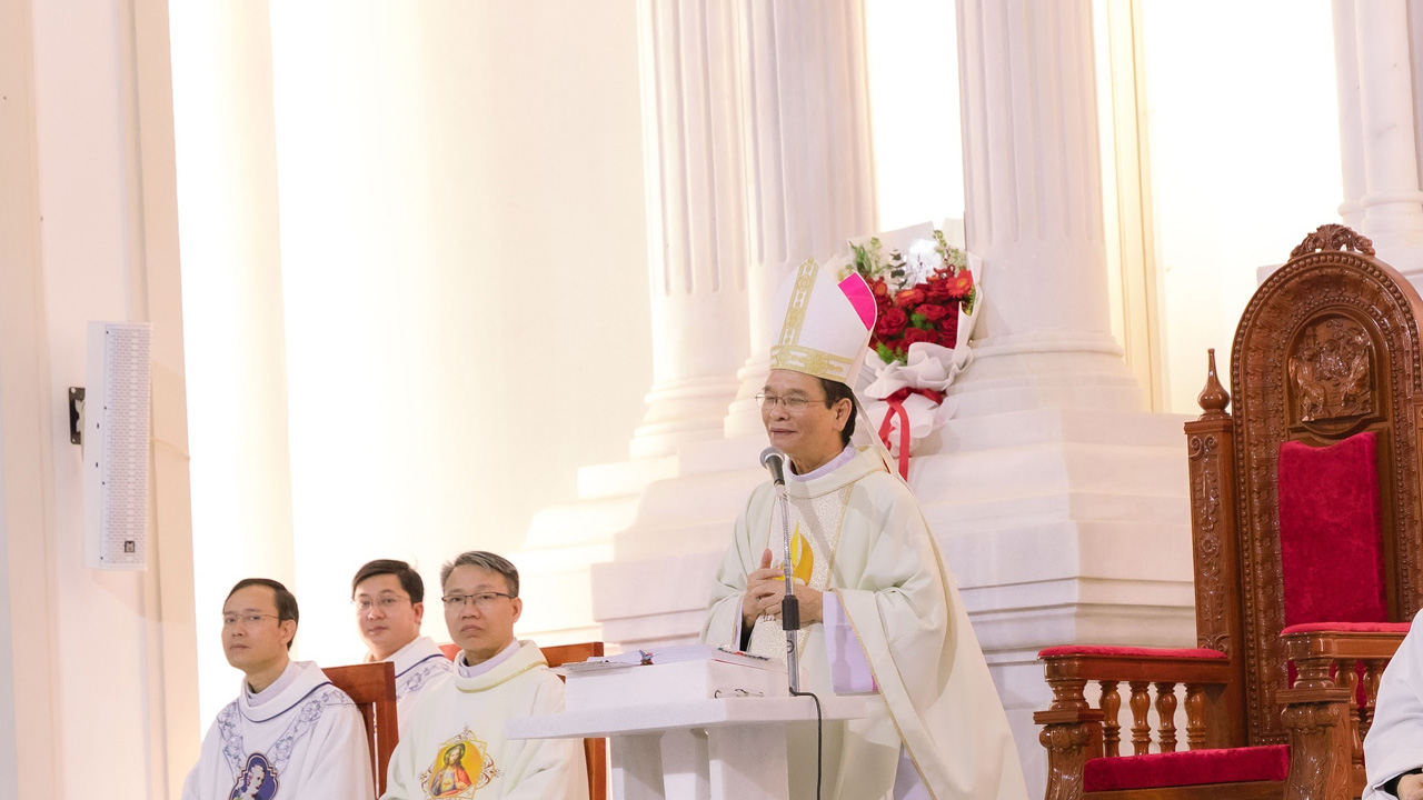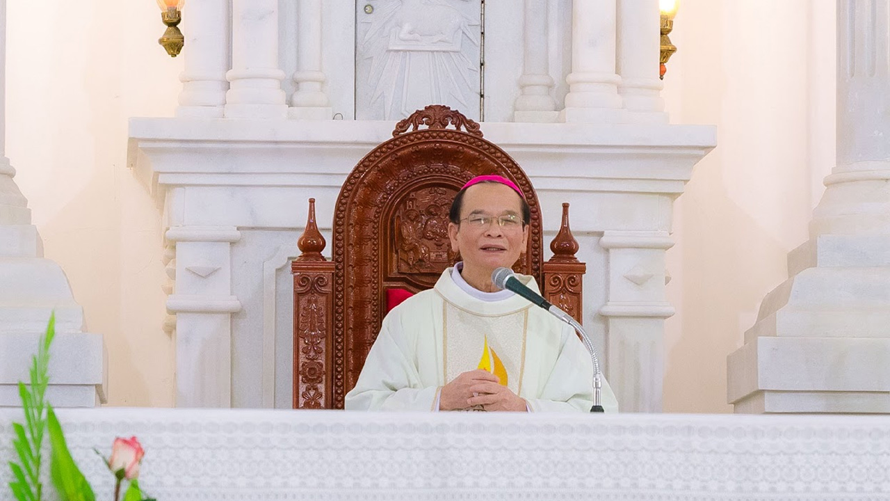 Tiếp đó, Đức cha Giuse ban huấn từ, chúc mừng lễ bổn mạng giáo xứ Quần Ngọc, chúc mừng 66 anh chị em tân tòng vừa lãnh nhận Bí tích Rửa Tội, đồng thời khích lệ toàn thể cộng đoàn hãy hăng say cộng tác với quý cha trong công cuộc loan báo Tin Mừng, để giáo xứ ngày càng trở thành một cộng đoàn sống động, hiệp nhất và tràn đầy lửa mến.