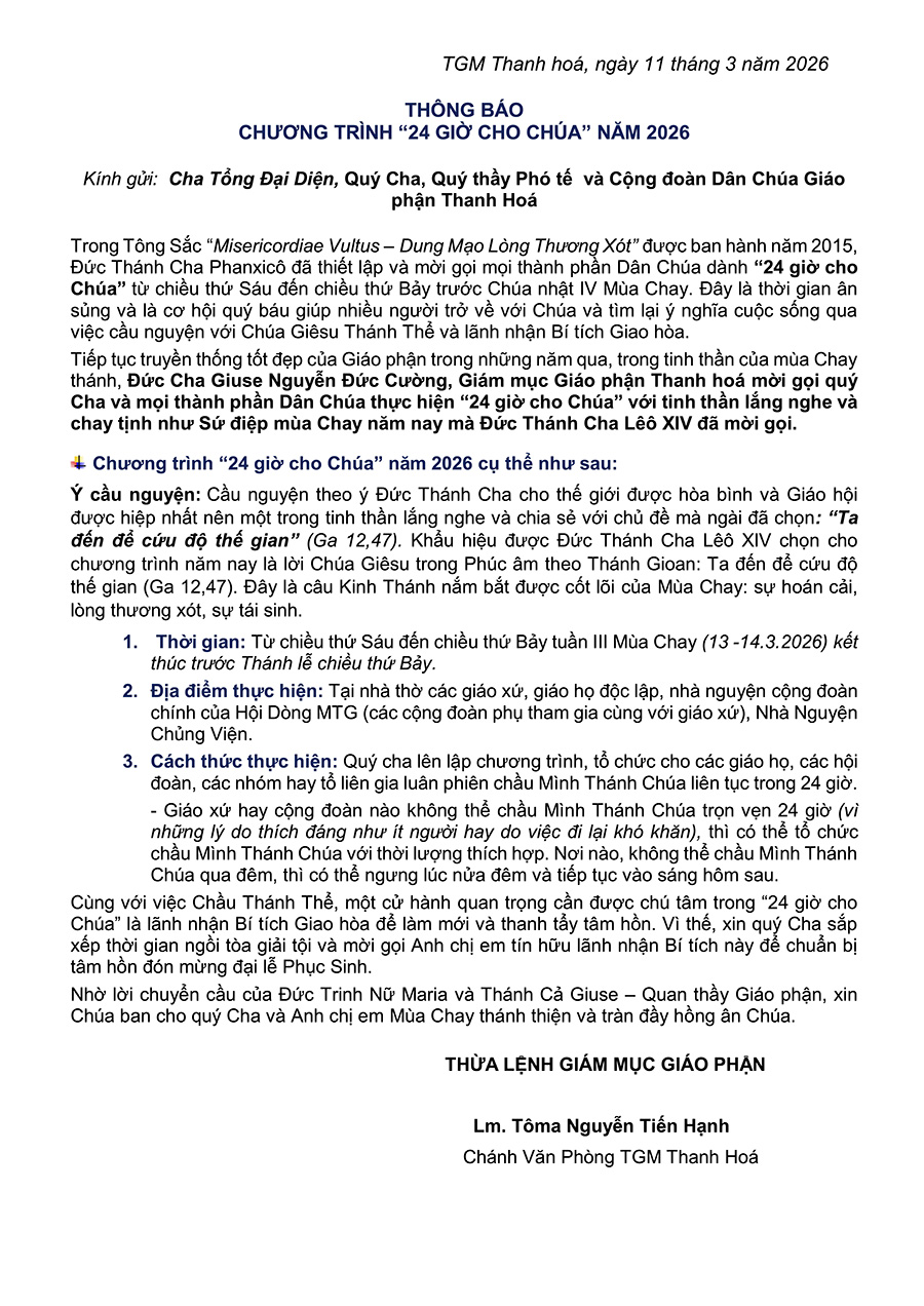 Để giúp các giáo xứ cử hành “24 giờ cho Chúa” cách sốt sắng và hiệp thông, Ban Truyền thông Giáo phận Thanh Hoá xin giới thiệu một số mẫu giờ Chầu Thánh Thể để quý cộng đoàn tham khảo và tùy nghi sử dụng trong các giờ chầu tại giáo xứ, giáo họ.