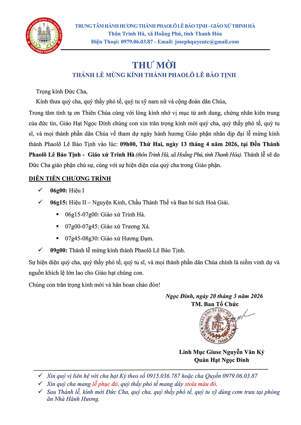 Thư mời: Thánh lễ mừng kính thánh Phaolô Lê Bảo Tịnh - Ngày hành hương Giáo phận Thanh Hoá