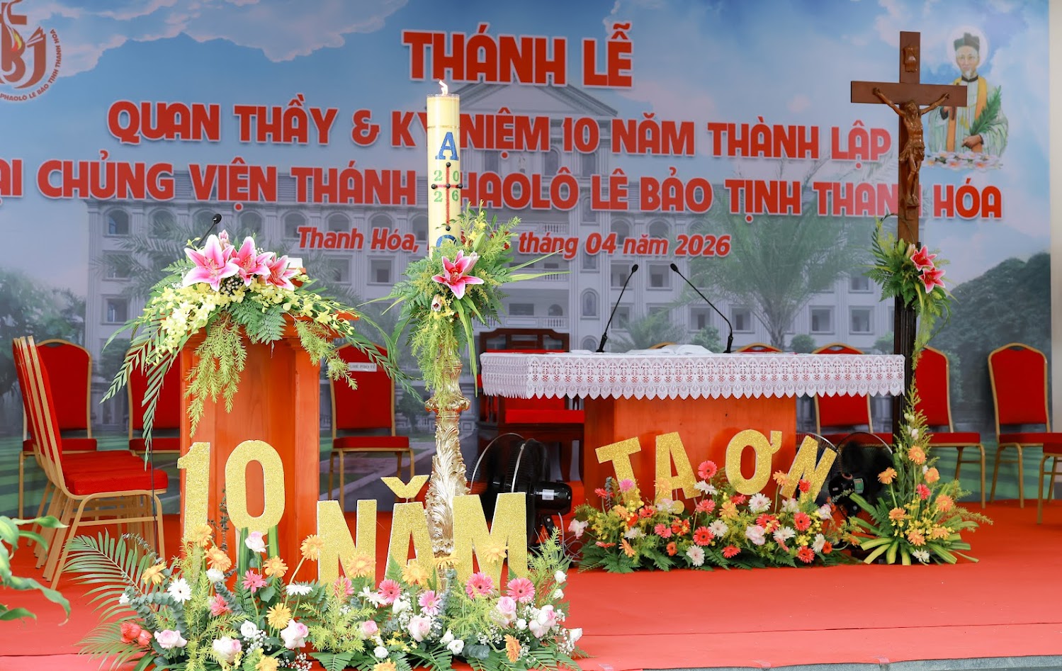 Vào lúc 9h00, sáng Thứ 7, ngày 18/04/2026 tại Đại Chủng viện Thánh Phao-lô Lê Bảo Tịnh Thanh Hóa đã diễn ra Thánh lễ mừng Quan thầy và Kỉ niệm 10 năm thành lập Đại Chủng viện. Hiện diện trong Thánh lễ gồm có: cha Micael Trịnh Ngọc Tứ -Tổng đại diện, cha Gioan Baotixita Đỗ Trọng Năng – Giám đốc Đại Chủng viện, quý cha trong ban đào tạo, quý cha hạt trưởng, quý cha trong và ngoài Giáo phận, quý nam nữ tu sĩ, chủng sinh, ứng sinh, quý ân nhân, phụ huynh và toàn thể cộng đoàn.