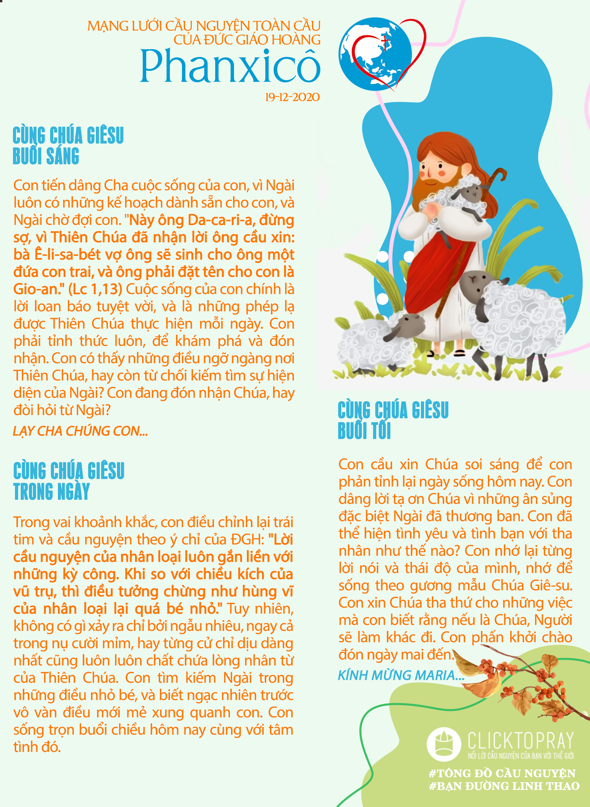 Con tiến dâng Cha cuộc sống của con, vì Ngài luôn có những kế hoạch dành sẵn cho con, và Ngài chờ đợi con. "Này ông Da-ca-ri-a, đừng sợ, vì Thiên Chúa đã nhận lời ông cầu xin: bà Ê-li-sa-bét vợ ông sẽ sinh cho ông một đứa con trai, và ông phải đặt tên cho con là Gio-an." (Lc 1,13) Cuộc sống của con chính là lời loan báo tuyệt vời, và là những phép lạ được Thiên Chúa thực hiện mỗi ngày. Con phải tỉnh thức luôn, để khám phá và đón nhận. Con có thấy những điều ngỡ ngàng nơi Thiên Chúa, hay còn từ chối kiếm tìm sự hiện diện của Ngài? Con đang đón nhận Chúa, hay đòi hỏi từ Ngài? Lạy Cha chúng con...