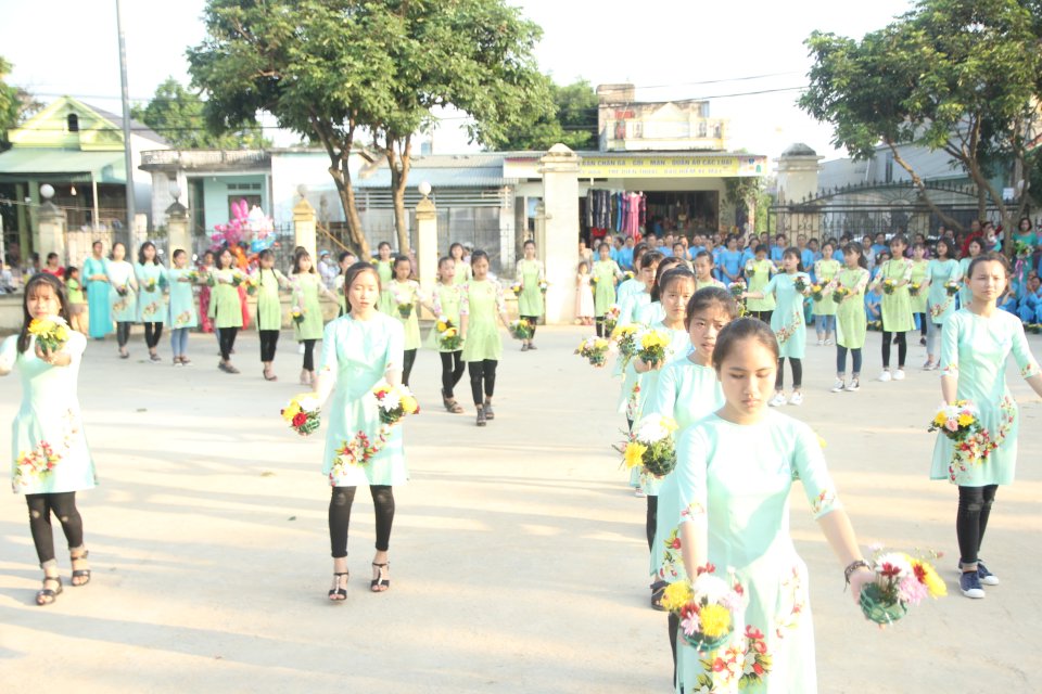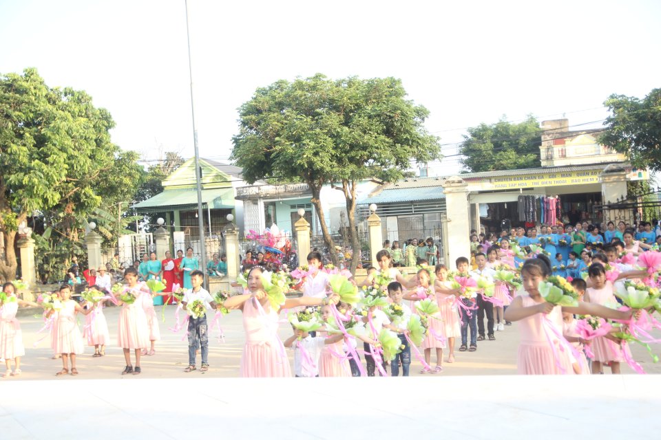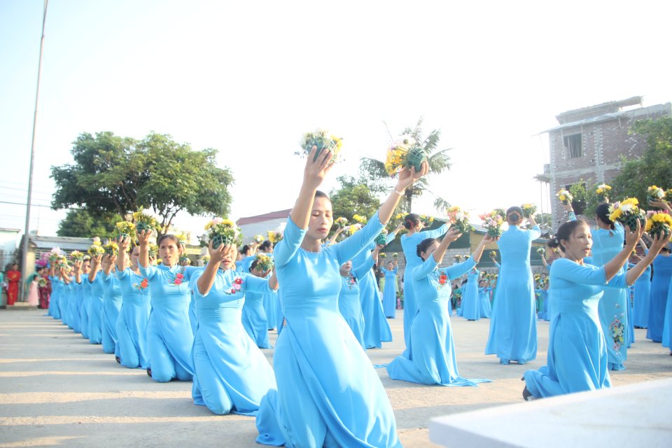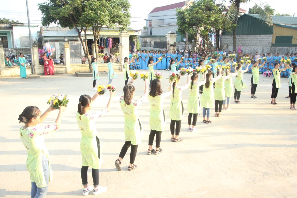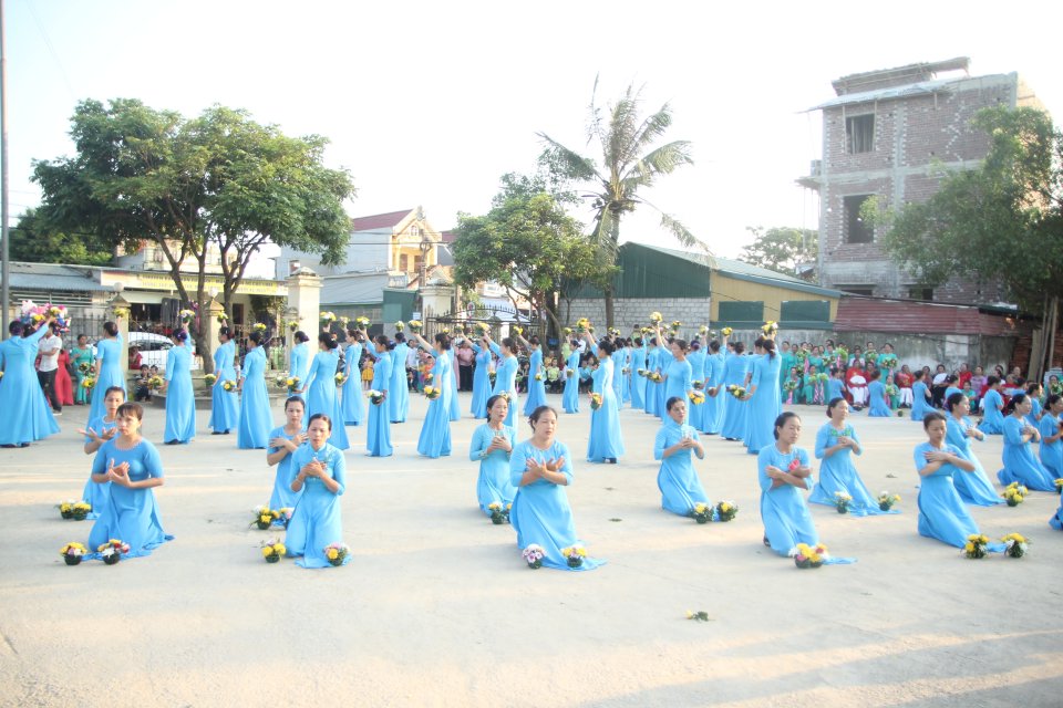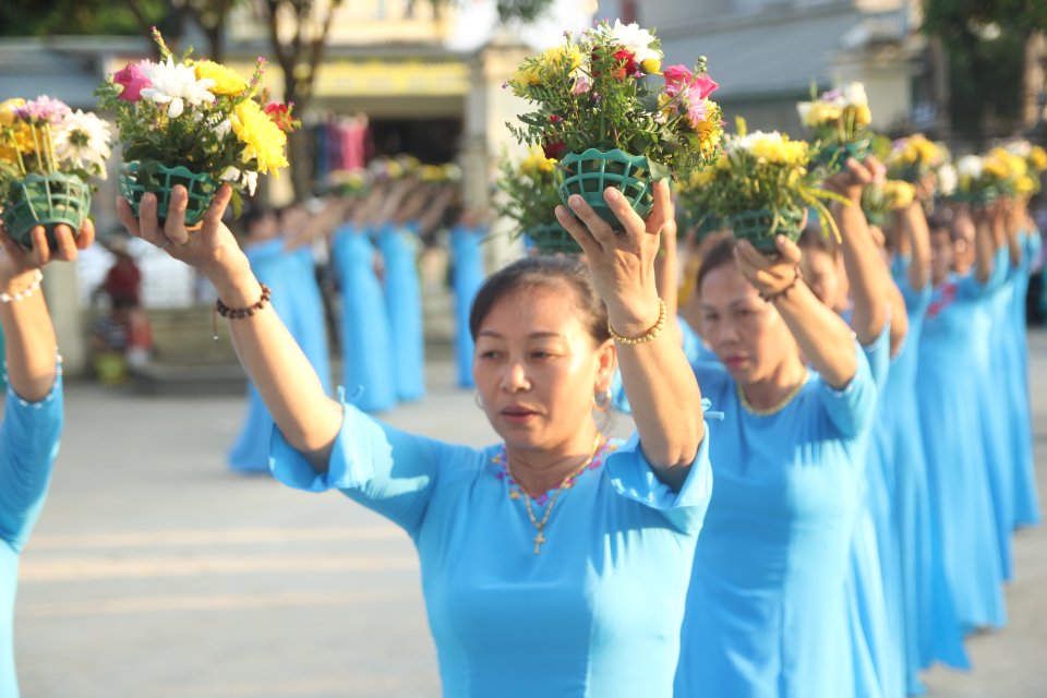 Mở đầu là hơn 60 em thiếu nhi Gia Hà cùng dâng lên Mẹ những bông hoa tươi thắm. Ánh mắt thơ ngây, nụ cười rạng rỡ hướng lên Mẹ như làm xua đi cái không khí ngột ngạt, oi bức của tiết trời tháng 5. Tiếp đến là đội hoa giới trẻ giáo xứ Thanh Bình và sau đó là đội hoa hiền mẫu của 2 giáo xứ lần lượt bày tỏ tâm tình yêu mến và tri ân Đức Mẹ.