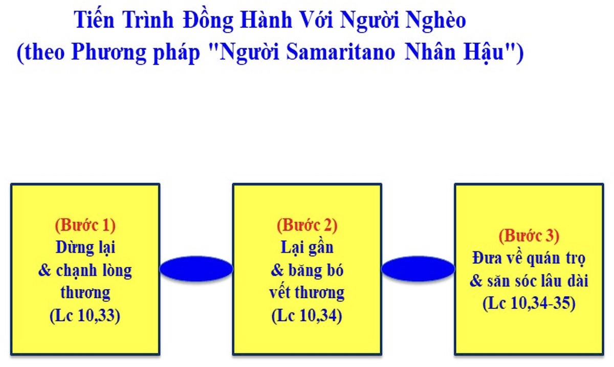 Để cụ thể hóa lời mời gọi của Đức Thánh cha, thiết nghĩ cần phải có một phương pháp tiếp cận người nghèo vừa mang tính thần học sâu sắc, vừa có tính thực tiễn hiệu quả và vượt qua các hình thức “từ thiện” nhất thời. Được gợi hứng từ chính Tông huấn Dilexi Te, dưới ánh sáng của Tông huấn này và những điều Đức Thánh cha Lêô XIV đã nói trong các số 105 đến 107, bài viết đề ra phương pháp “Người Samaritanô nhân hậu” như là một gợi ý về một cách thức đồng hành toàn diện với người nghèo. Đây không chỉ là một hành vi đạo đức hay một hành vi bác ái ngẫu nhiên mà còn là một mô hình hành động cụ thể, một lối sống đức tin và là một hành trình đồng hành thiêng liêng với người nghèo. Qua đó, người môn đệ Đức Kitô cùng với người nghèo tiến đến ơn cứu độ.