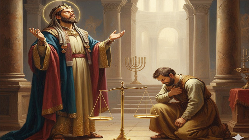 Cả hai người đều bắt đầu lời cầu nguyện bằng việc gọi tên Thiên Chúa: “Lạy Thiên Chúa,” nhưng người thu thuế khi ra về được trở nên công chính còn người Pharisiêu thì không. Khẳng định này có thể làm cho nhiều người bất ngờ (Lc 18,14). Đây là một sự đảo ngược lạ lùng bởi Thiên Chúa, vì tiêu chuẩn mà Thiên Chúa dùng để đánh giá hành vi của mỗi người hoàn toàn khác với chúng ta. Thiên Chúa không chỉ để ý đến cái bên ngoài, nhưng nhìn thấu tấm lòng bên trong. Ngài chỉ thi ân khi gặp được một tấm lòng chờ đợi. Chứ không phải hễ ai thưa lạy Chúa… là được vào Nước trời (Mt 7,21).
