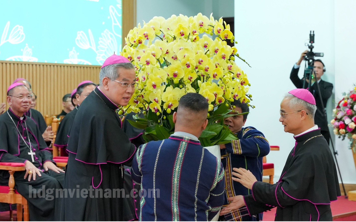 Sau đó, Đức Tổng Giám mục Giuse Nguyễn Năng thay mặt Hội đồng Giám mục Việt Nam đón nhận bình hoa tươi thắm từ Đức Cha Đa Minh – biểu tượng cho tình huynh đệ, yêu thương và niềm tri ân.