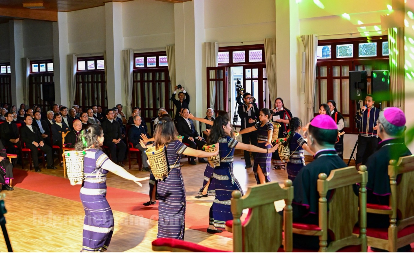 Các bạn trẻ dân tộc Lạch thuộc Giáo xứ Lang Biang đã mang đến tiết mục múa “Gieo Giống”, diễn tả hành trình loan báo Tin Mừng trên vùng cao nguyên – nơi từng in dấu chân các nhà thừa sai và vẫn đang trổ sinh hoa trái đức tin.