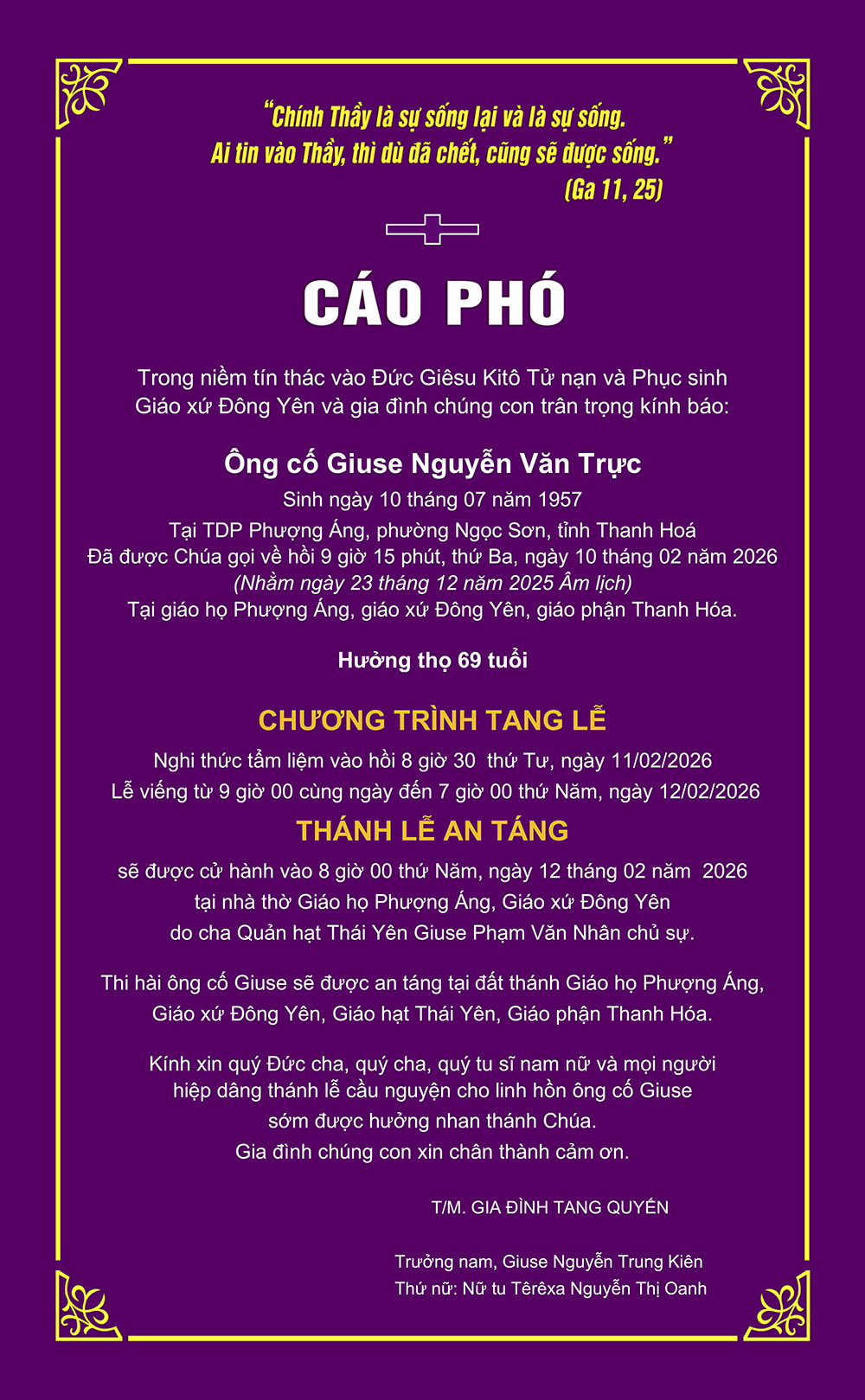 Cáo phó: Ông cố Giuse Nguyễn Văn Trực, thân phụ nữ tu Têrêxa Nguyễn Thị Oanh, Tu hội nữ tử bác ái Vinh Sơn, đã an nghỉ trong Chúa, ngày 10/02/2026