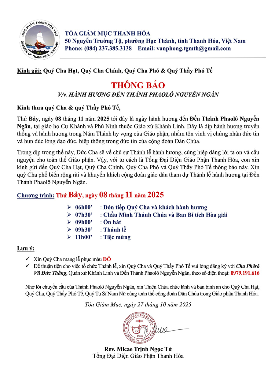 Thông báo: Ngày hành hương năm thánh tại đền thánh Phaolô Nguyễn Ngân
