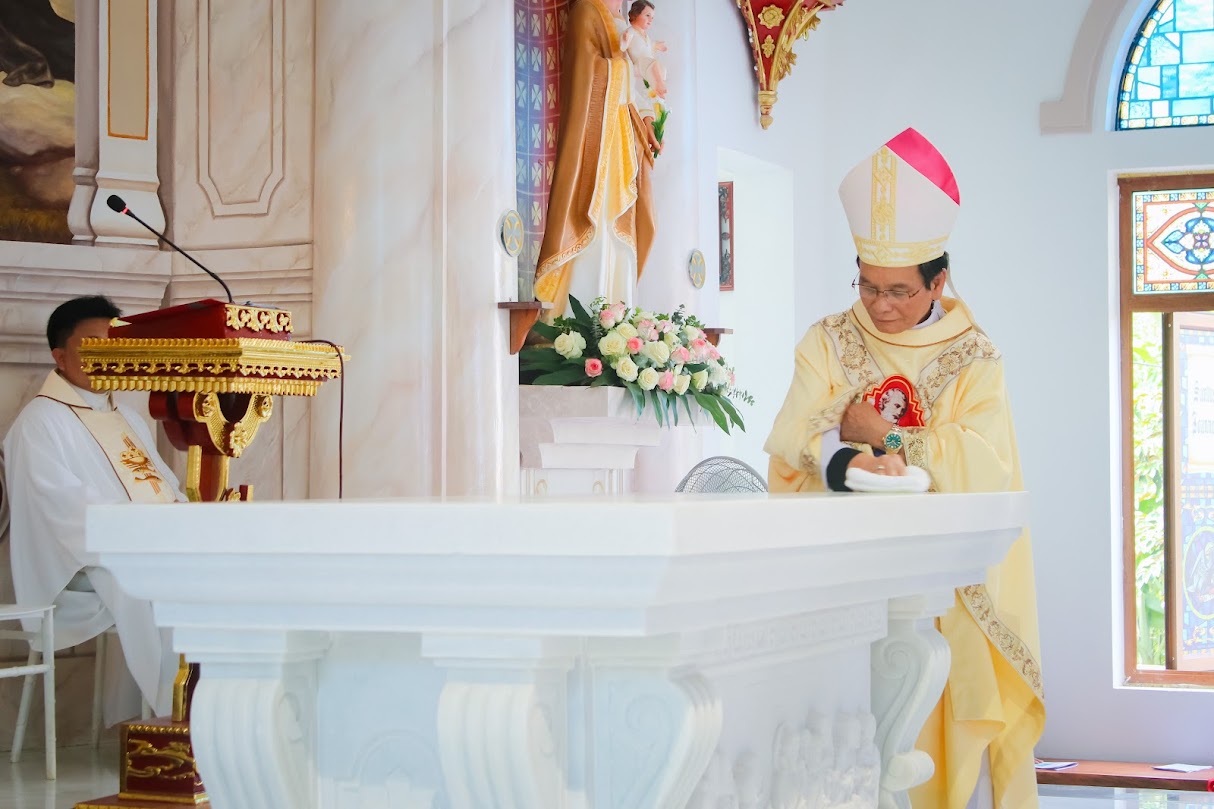 Tiếp theo đó, Đức Cha Giuse chủ sự nghi thức xức dầu bàn thờ với ý nghĩa bàn thờ giờ đây trở nên thân thể của Đức Kitô, Đấng được xức dầu Thánh Thần.